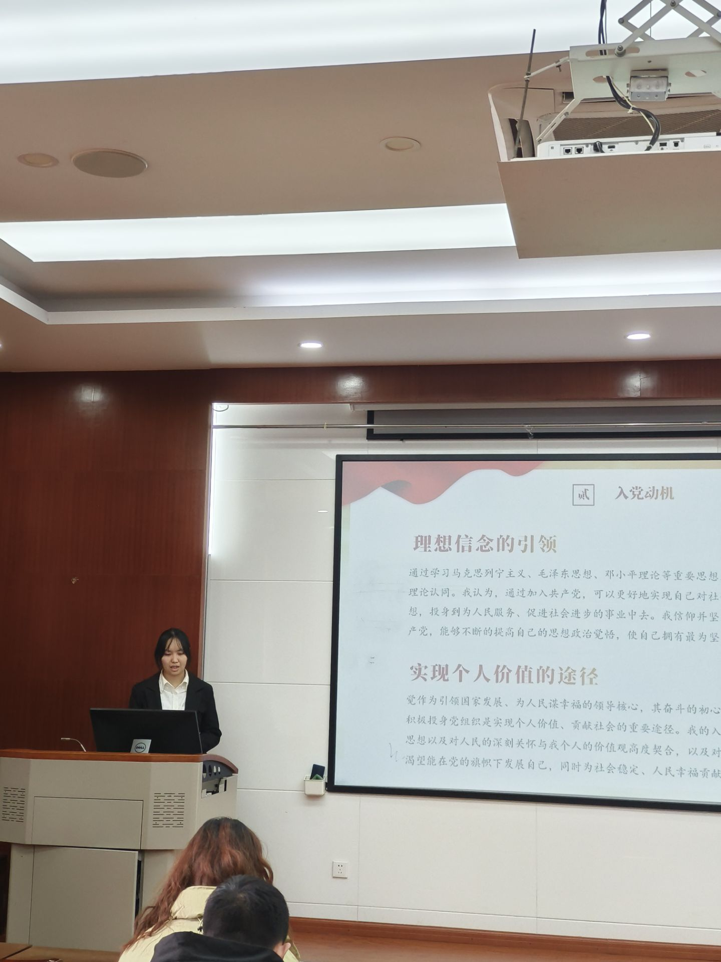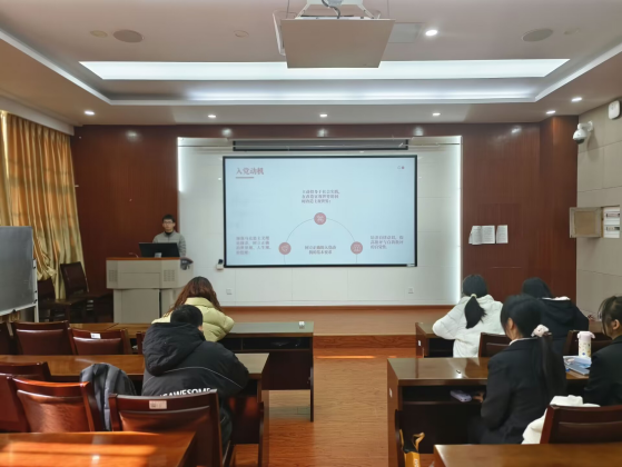 在大会开始,顾潇老师宣布了大会具体议程,会议严格按照党组织接受预备党员的程序,对新接受预备党员问题进行了讨论。侯颖、王嘉琦、曾家荣三位同志分别就自己对党的认识、入党动机、本人履历、不足及改进和未来规划等方面进行了汇报答辩。在听取入党介绍人意见及支委会考察意见后,经过正式党员提问、无记名投票等环节,三名同志均以全票通过,被党组织接收为预备党员。