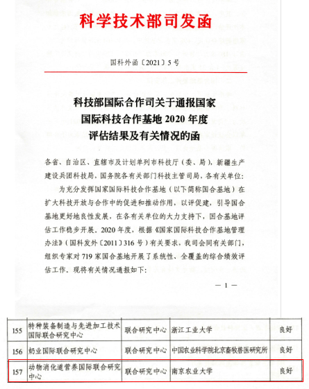 近日,科技部公布了对全国现有国际科技合作基地绩效评估结果,动物消化道营养国际联合研究中心获得良好。
