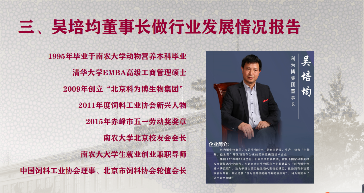 吴培均董事长结合自身的求学经历、创业路程以及企业发展,阐述了自己对畜牧行业未来发展的理解和认识。他说,畜牧业是关乎国民生活的重要支柱产业,是国家食品安全战略的重要组成部分,随着人们生活水平的持续提升,畜牧行业一定拥有更加广阔的发展前景。他希望家长们能够鼓励学生树立正确的专业观、职业观,引导学生努力成为对社会有价值,对未来有期望的优秀学生。
