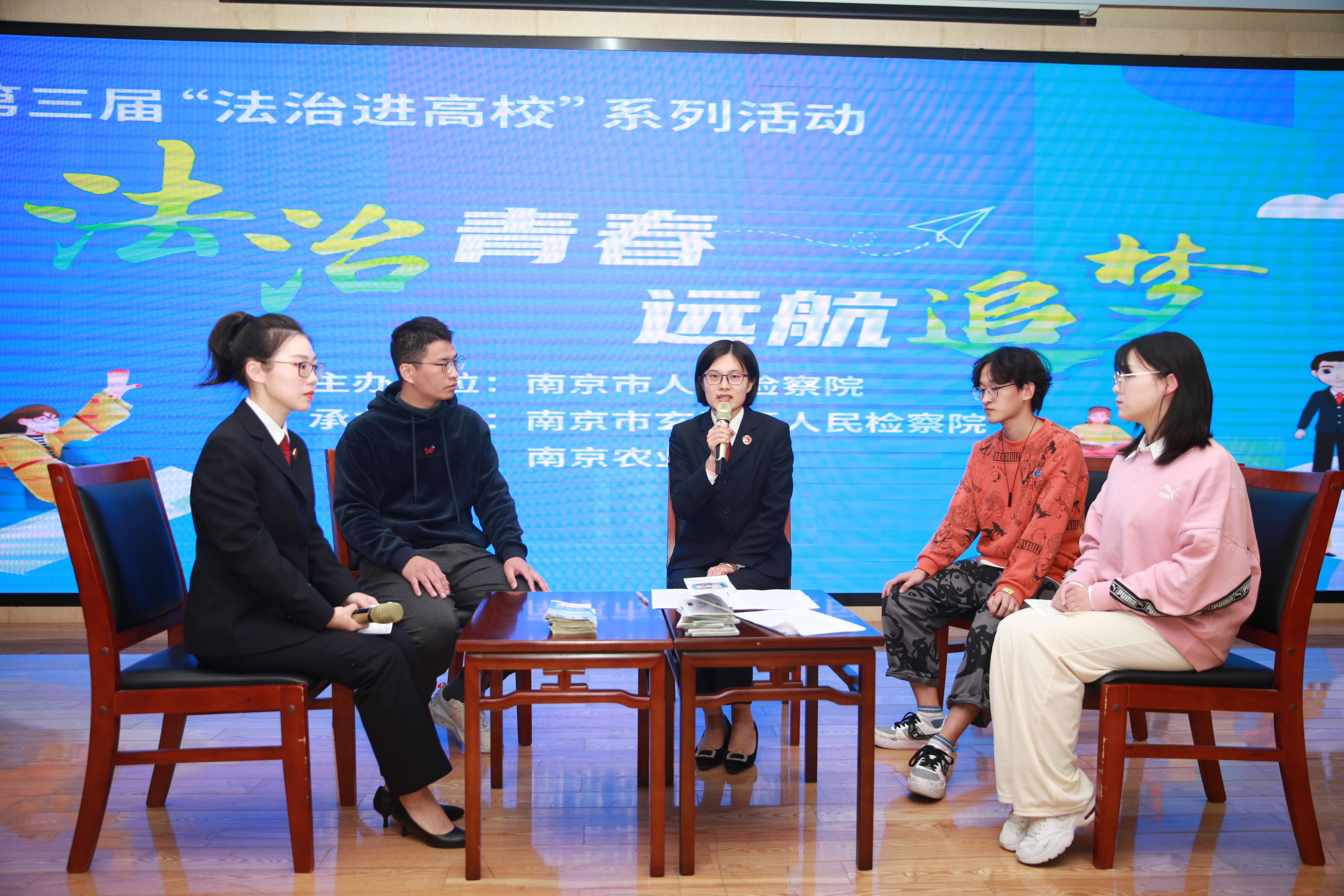 教育片播放后,由检察官、学校师生代表以及主持人组成的法治宣传主题沙龙开始,玄武区院孙伟伟、南京农业大学的教师、学生代表从不同角度,与在场同学一起,围绕网络贷款和校园暴力两个主题进行了热烈的讨论,现场气氛非常热烈。