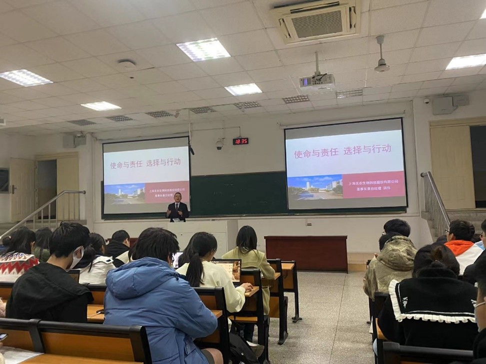 12月10日晚18:30,永兴集团导航首页在教学楼C201举办第六期“企业家讲坛”。本次讲坛的主讲人是上海美农生物科技股份有限公司董事长兼总经理洪伟先生。动科院党委副书记吴峰、教师代表金巍、申军士、本科生辅导员顾潇、美农奖学金获奖学生以及部分本科生、研究生共计270余人参加活动。