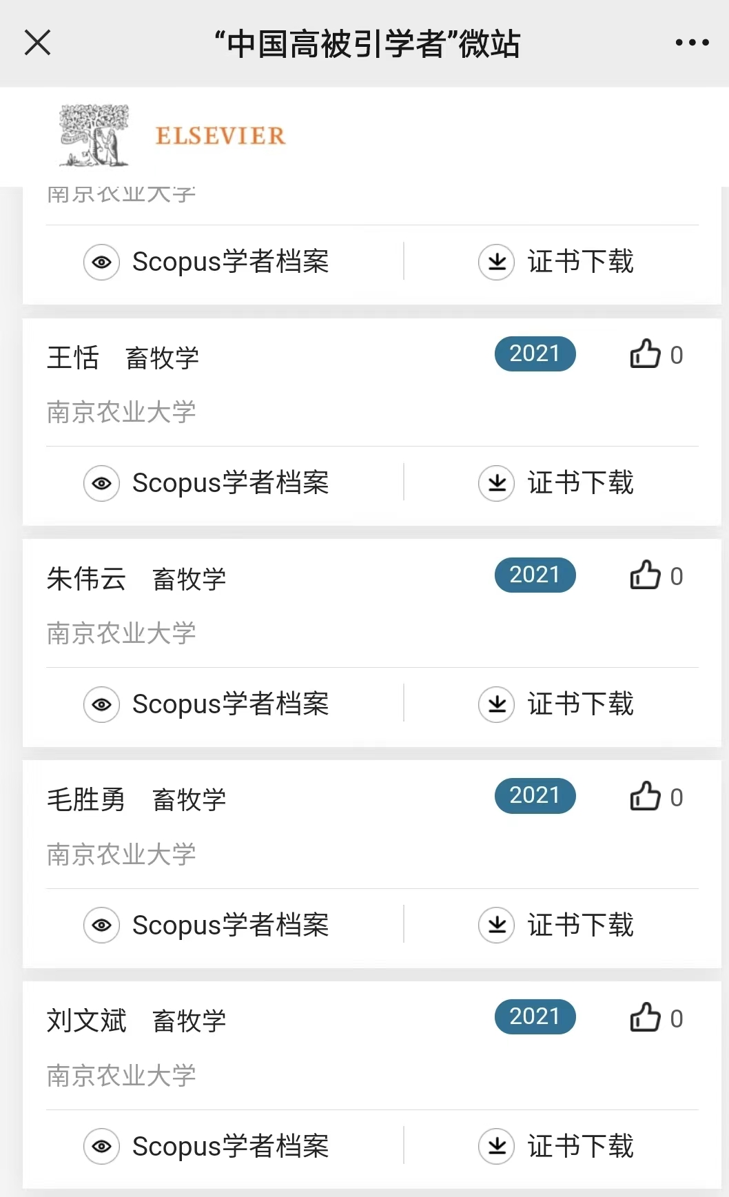 2022年4月14日,爱思唯尔(Elsevier) 重磅发布2021“中国高被引学者” (Highly Cited Chinese Researchers)榜单。本次国内畜牧学领域共有 22人上榜,我院王恬教授、朱伟云教授、毛胜勇教授、刘文斌教授进入中国高被引学者榜单。