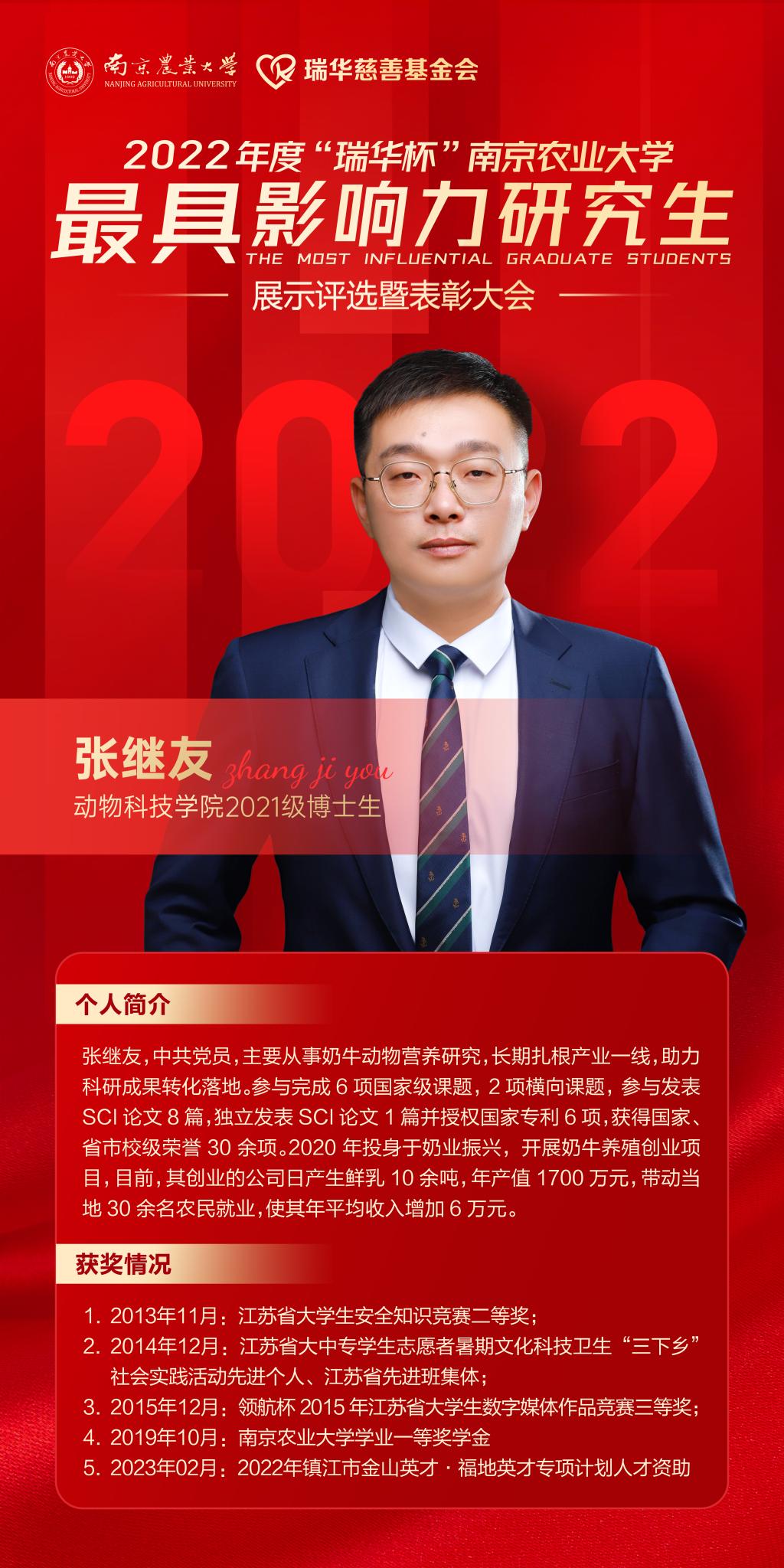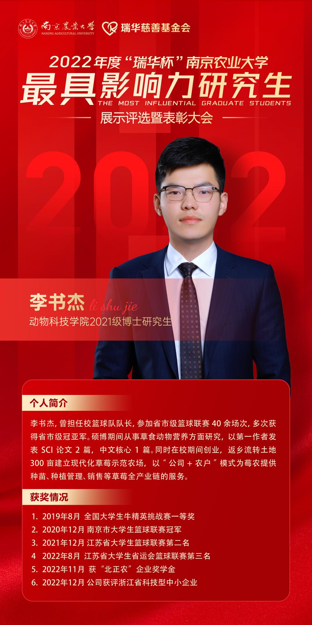 2023年3月2日晚19:00,2022年度南京农业大学最具影响力研究生评选暨表彰大会在金陵研究院三楼报告厅举行。经过精彩角逐,我院李书杰与张继友荣膺2022年度最具影响力研究生!