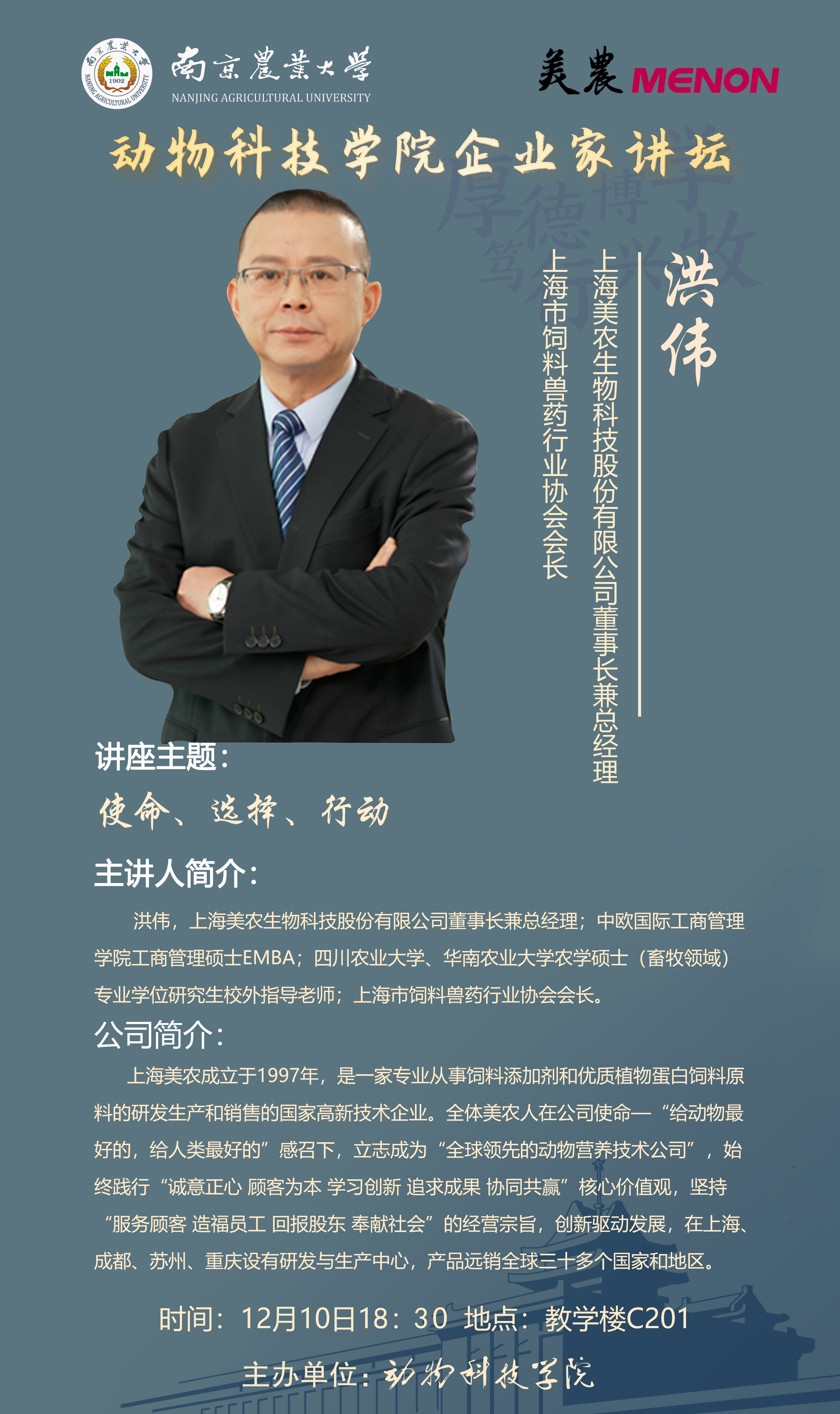 洪伟:上海美农生物科技股份有限公司董事长兼总经理;中欧国际工商管理学院工商管理硕士EMBA;四川农业大学、华南农业大学农学硕士(畜牧领域)专业学位研究生校外指导老师;上海市饲料兽药行业协会会长。