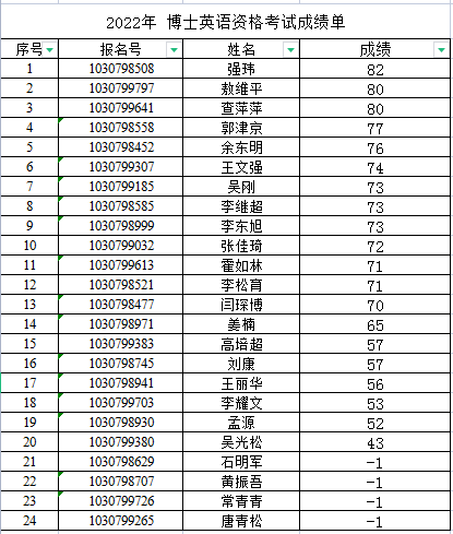 现将2022年博士招生英语资格考试成绩公示如下,公示期为2022年4月18日-20日,合格线为60分,-1表示缺考。英语测试合格的考生直接进入面试。请考生关注研究生院网站《南京农业大学2022年博士研究生复试录取工作通知》和《永兴集团导航首页2022年博士研究生复试录取工作细则》,做好复试准备。